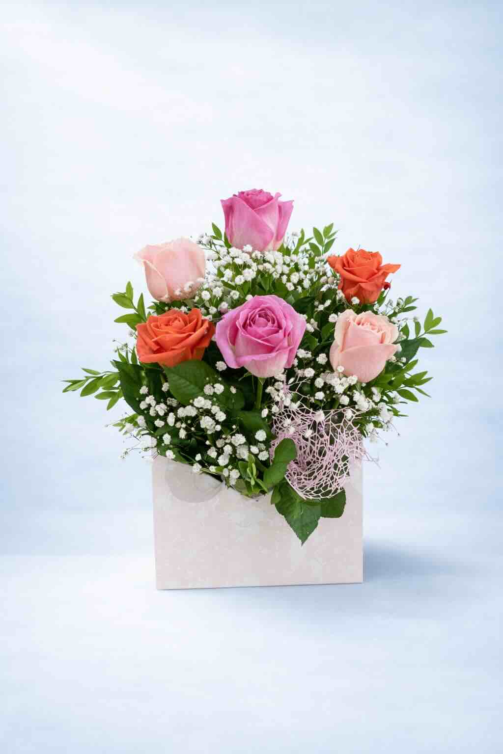 Looking for something different then here’s your answer. This cute arrangement is so beautiful with a mixture and is bursting with Roses, Babys Breath, Seasonal foliage in a box.